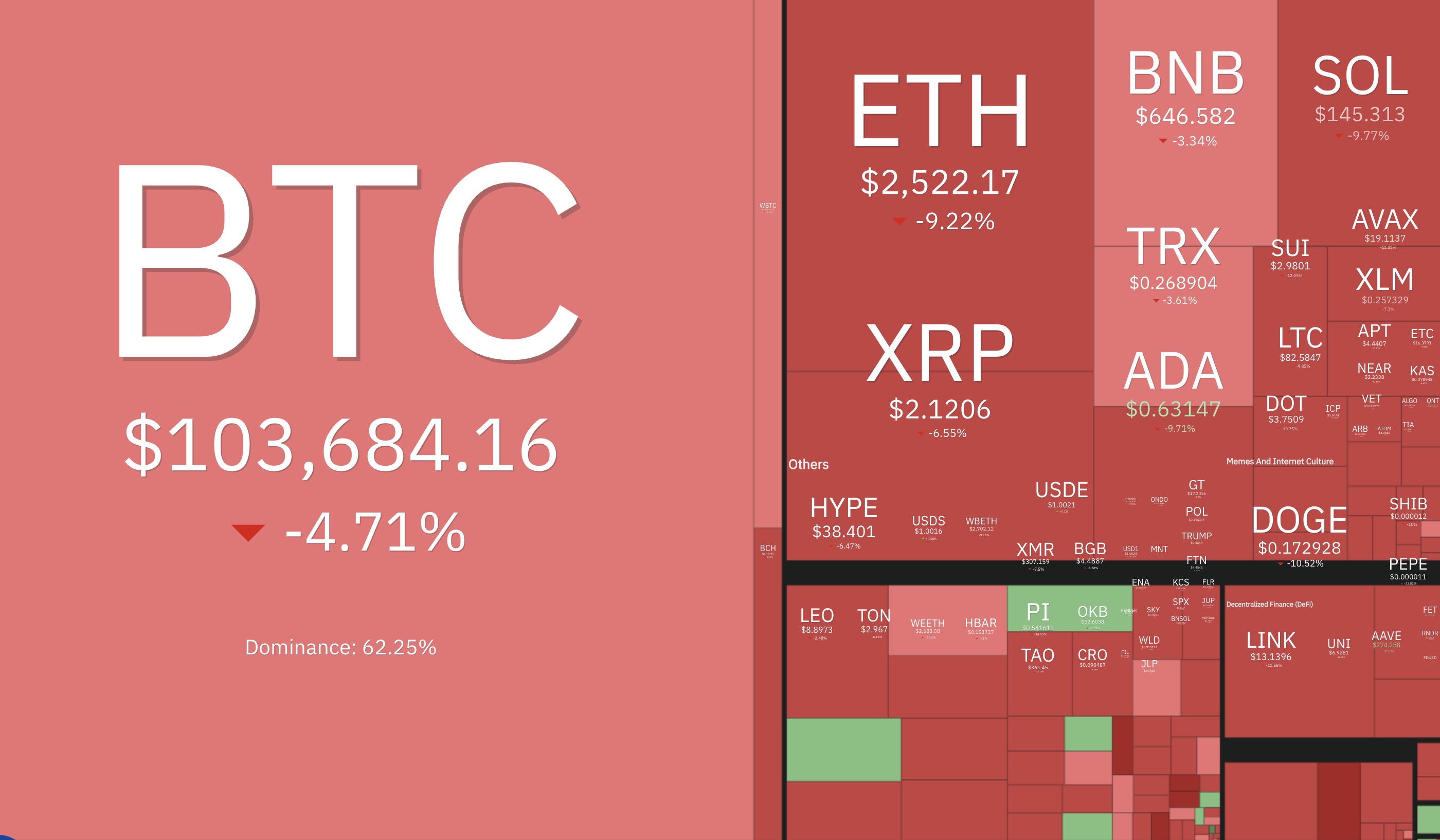 Trong khi đó, thị trường tiền điện tử rơi vào trạng thái bán tháo mạnh. Bitcoin mất 4% trong 24 giờ qua, hiện giao dịch quanh 103.000 USD. Các altcoin lớn như Ethereum (ETH), Solana (SOL), BNB cũng lao dốc theo.