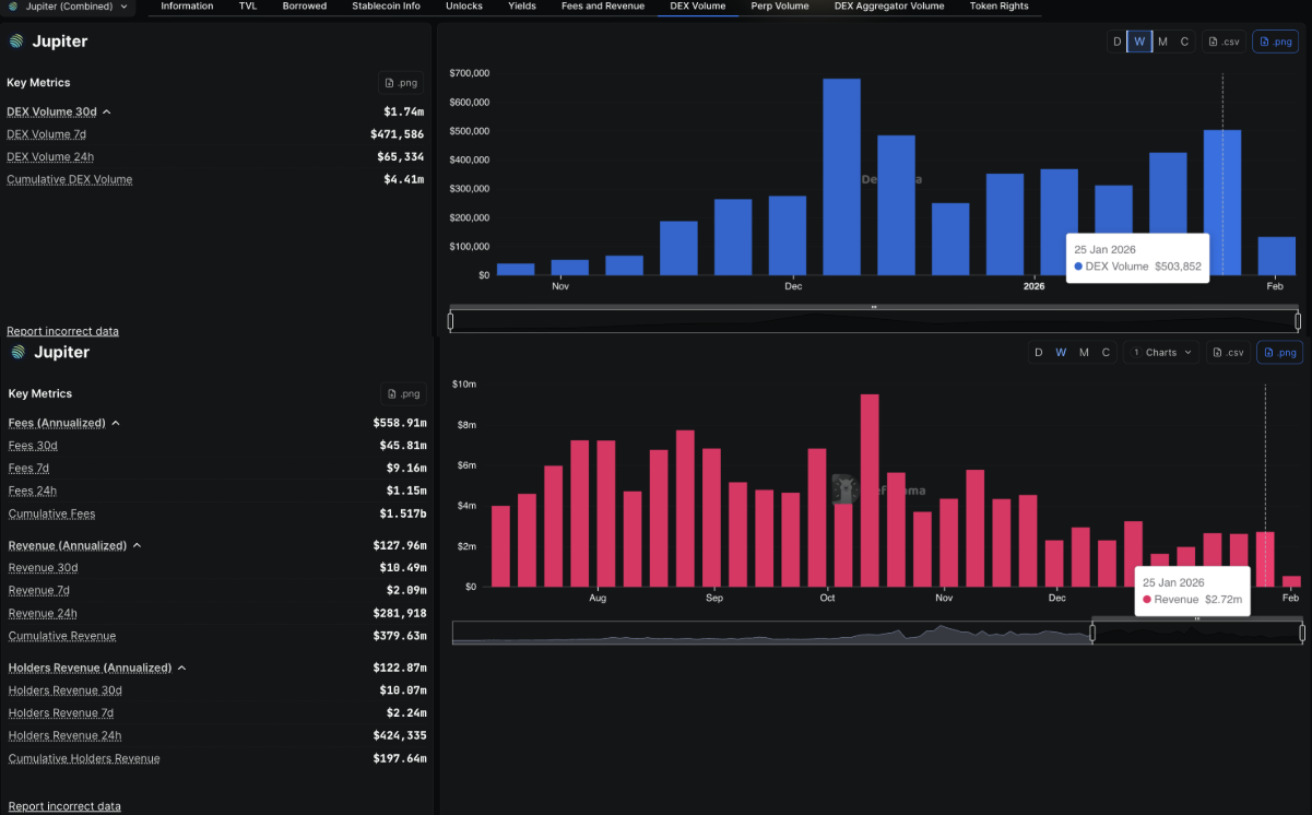Theo số liệu từ DeFiLlama, doanh thu của Jupiter đã vượt mốc 2,60 triệu USD trong ba tuần gần nhất. Cùng thời điểm, khối lượng giao dịch trên các sàn DEX đạt 503.852 USD trong tuần qua, tăng mạnh so với mức 425.680 USD của tuần trước đó. Những chỉ báo này cho thấy mức độ tương tác của người dùng đang tăng trưởng đều đặn — một xu hướng được kỳ vọng sẽ còn tiếp diễn trong các tuần tới khi hiệu ứng từ việc tích hợp Coinbase lan tỏa rộng hơn.