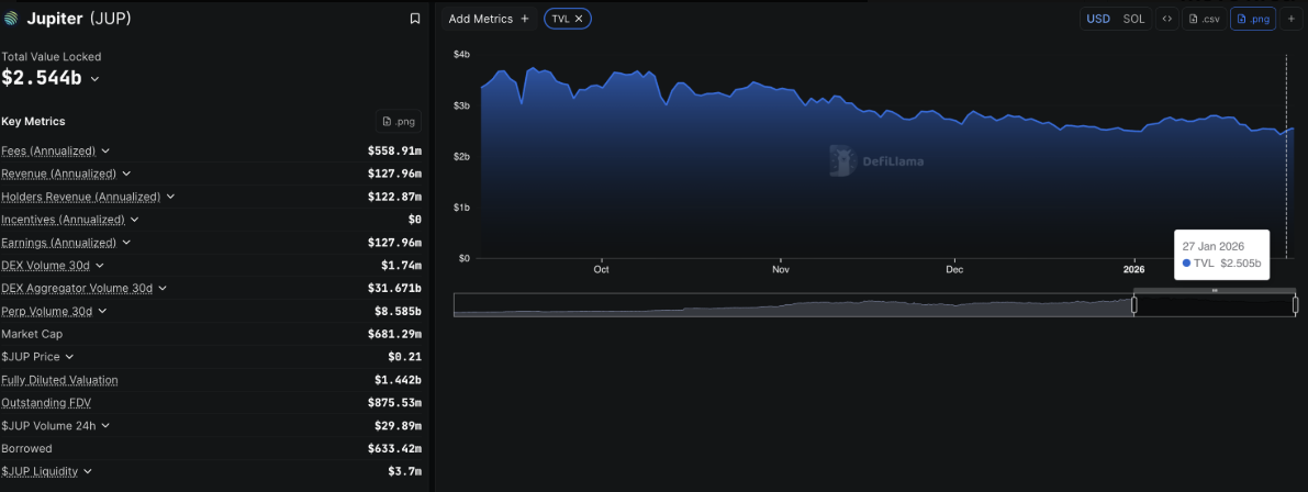 Song hành với đà cải thiện về nhu cầu mạng lưới, tổng giá trị bị khóa (TVL) trên Jupiter hiện đạt 2,544 tỷ USD, tăng so với mức 2,505 tỷ USD ghi nhận vào thứ Ba, phản ánh niềm tin ngày càng lớn của người dùng thông qua lượng tiền gửi tiếp tục chảy vào nền tảng.