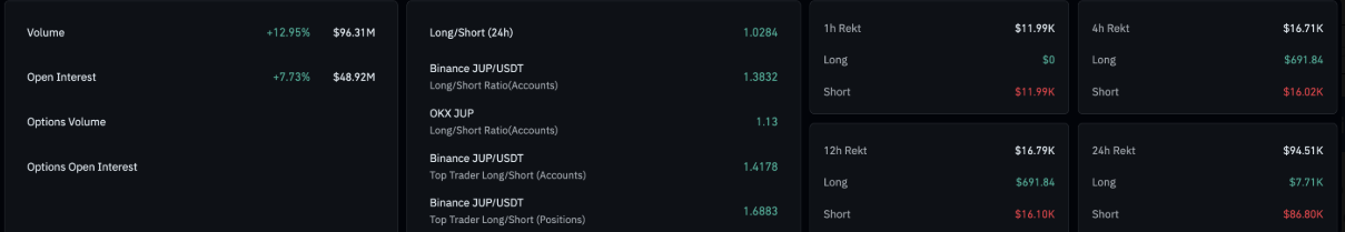 Trên thị trường phái sinh, hợp đồng tương lai Jupiter chứng kiến dòng tiền đổ vào mạnh mẽ khi các vị thế bi quan liên tiếp bị “quét sạch”. Số liệu từ CoinGlass cho thấy hợp đồng mở (OI) của JUP đã tăng 7,73% chỉ trong 24 giờ, đạt 48,92 triệu USD, phản ánh quy mô các hợp đồng đang lưu hành gia tăng khi trader mở rộng mức độ tiếp xúc với tài sản này. Đáng chú ý, giá trị các lệnh bán khống bị thanh lý lên tới 86.800 USD, cao gấp nhiều lần so với mức 7.710 USD của lệnh mua, cho thấy phe gấu đang chịu tổn thất nặng nề và động lực thị trường đang nghiêng rõ rệt về phía bên mua.