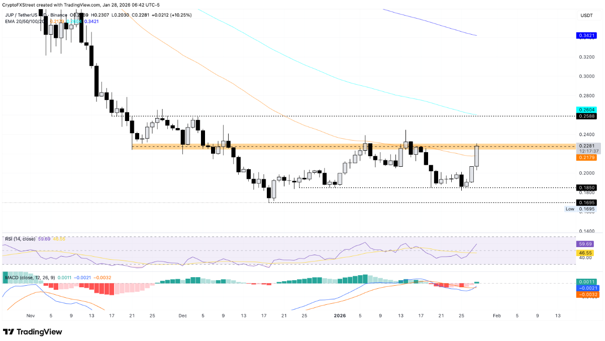Jupiter hiện đang dao động quanh đường trung bình động hàm mũ (EMA) 50 ngày ở mức 0,2179 USD, trong bối cảnh EMA 100 ngày và 200 ngày vẫn hướng xuống. Điều này cho thấy xu hướng giảm dài hạn chưa bị phá vỡ, dù giá đã ghi nhận nhịp phục hồi đáng chú ý trong thời gian gần đây.