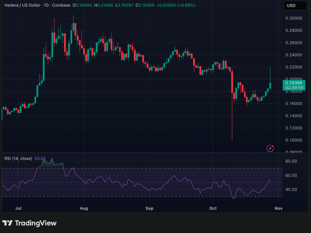 Trái ngược với xu hướng chung, ETF HBR của Hedera dù chỉ đạt 8 triệu USD khối lượng giao dịch nhưng vẫn giúp giá token bật tăng 4,9% lên 0,193 USD. Chỉ báo RSI nhích lên mốc 53, phản ánh tâm lý lạc quan đang quay trở lại thị trường.