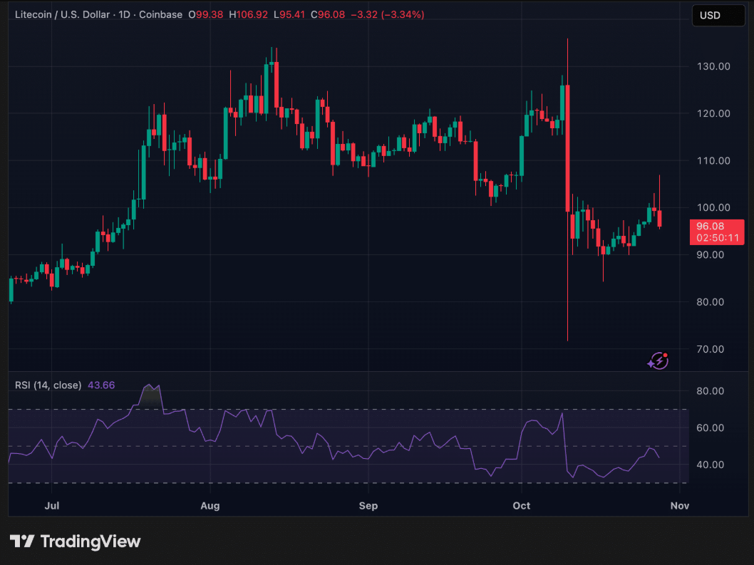 ETF LTCC của Litecoin khởi đầu khá khiêm tốn khi chỉ ghi nhận khoảng 1 triệu USD giao dịch trong ngày đầu tiên. Trên biểu đồ giá, LTC giảm 3,3% về vùng 96 USD, trong khi chỉ báo RSI quanh mốc 43 tiếp tục phản ánh lực cầu yếu.