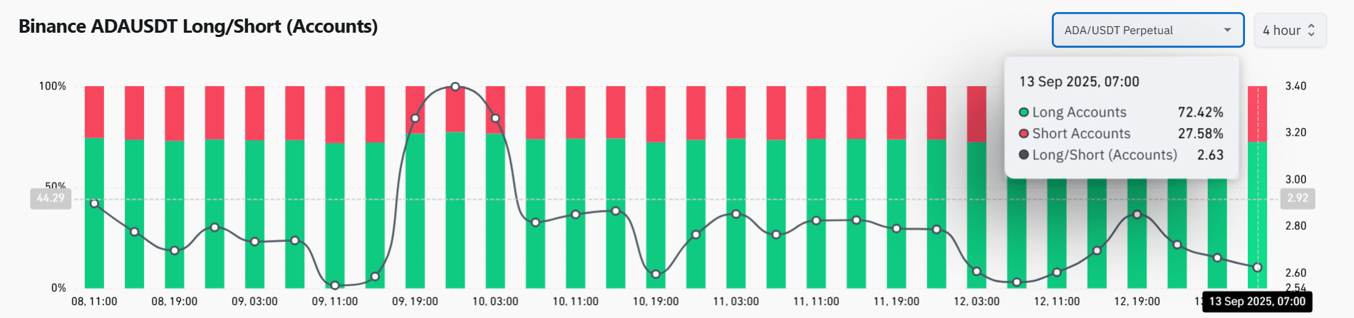 Dữ liệu phái sinh từ Binance cho thấy lệnh Long chiếm ưu thế rõ rệt, với hơn 72% tổng số vị thế, so với 27,58% lệnh Short. Sự chênh lệch áp đảo này chứng tỏ niềm tin mạnh mẽ của các nhà đầu tư vào tiềm năng mở rộng đà tăng của ADA, hướng tới các mục tiêu Fibonacci cao hơn.