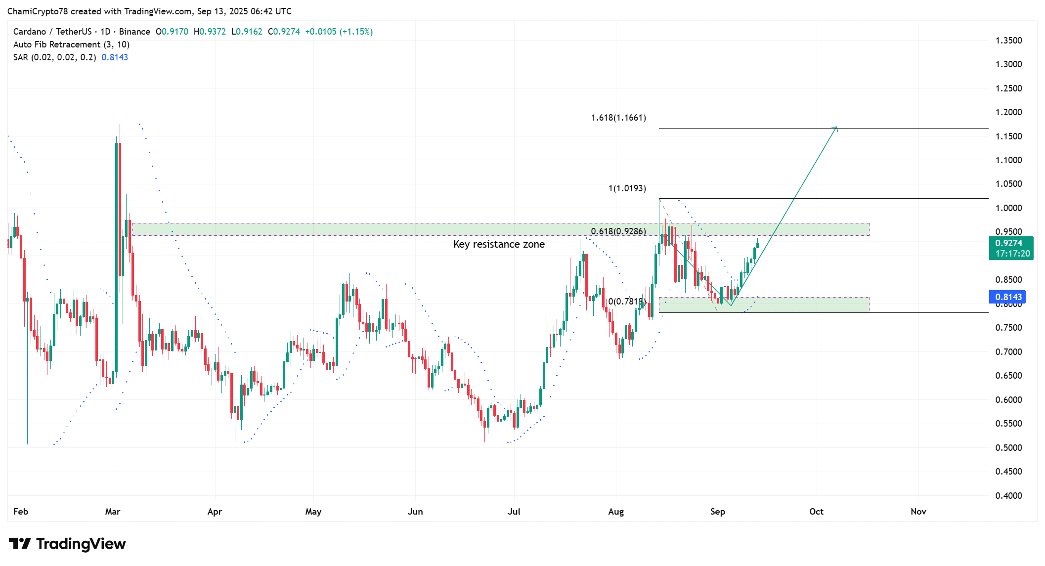 Biểu đồ giá cho thấy ADA đang củng cố quanh mức 0,93 USD, đây là vùng được xác định bởi mức Fibonacci thoái lui 0,618 và cũng là rào cản lịch sử đáng kể. Việc vượt qua ngưỡng này sẽ mở đường cho mục tiêu Fibonacci tiếp theo ở 1,019 USD, với triển vọng kéo dài tới 1,166 USD nếu đà tăng được duy trì.