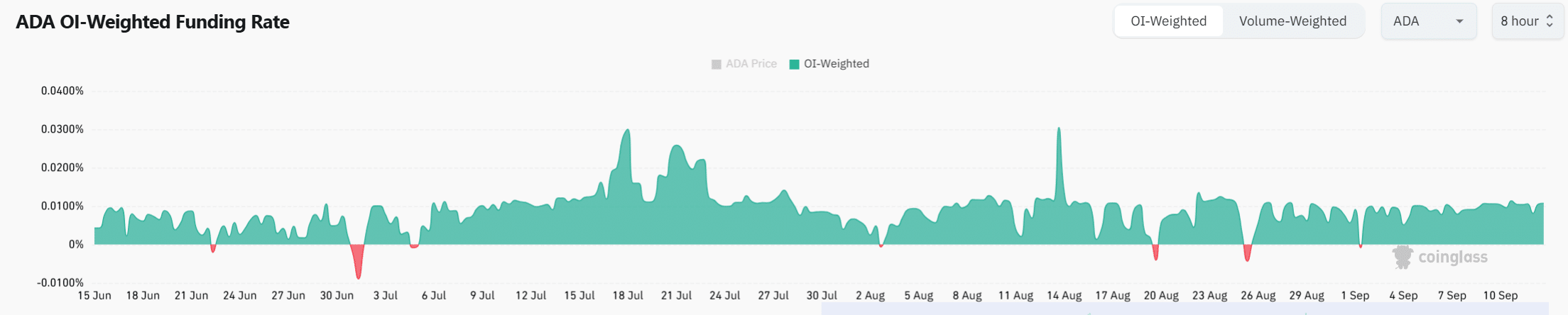 Hoạt động đầu cơ tiếp tục tăng, khi hợp đồng mở (OI) tại thị trường tương lai tăng 3,67% lên 1,92 tỷ USD. OI tăng thường phản ánh dòng vốn mới đổ vào thị trường, khẳng định niềm tin của các nhà giao dịch vào triển vọng tăng giá của ADA.