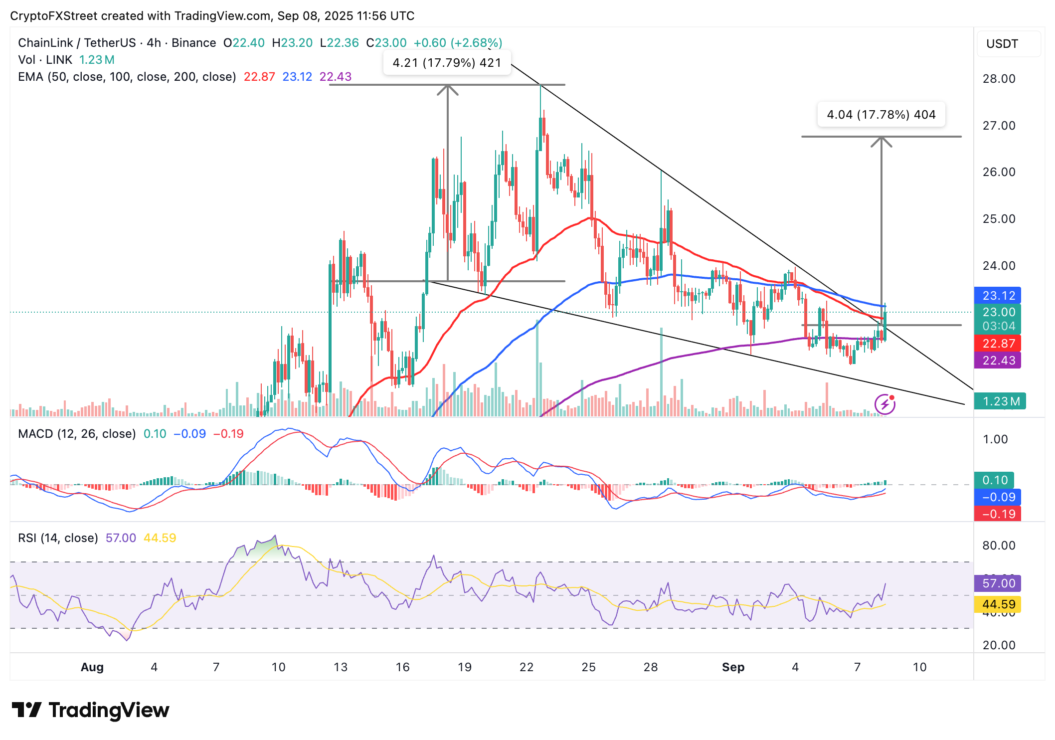 Trên phương diện kỹ thuật, LINK hiện đang duy trì vị thế trên mốc 23 USD, sau khi bứt phá khỏi mô hình nêm giảm trên khung biểu đồ 4 giờ. Token oracle này cũng đang giữ vững trên đường Trung bình động hàm mũ (EMA) 50 kỳ ở mức 22,87 USD – một tín hiệu hỗ trợ cho cấu trúc tăng giá ngắn hạn.