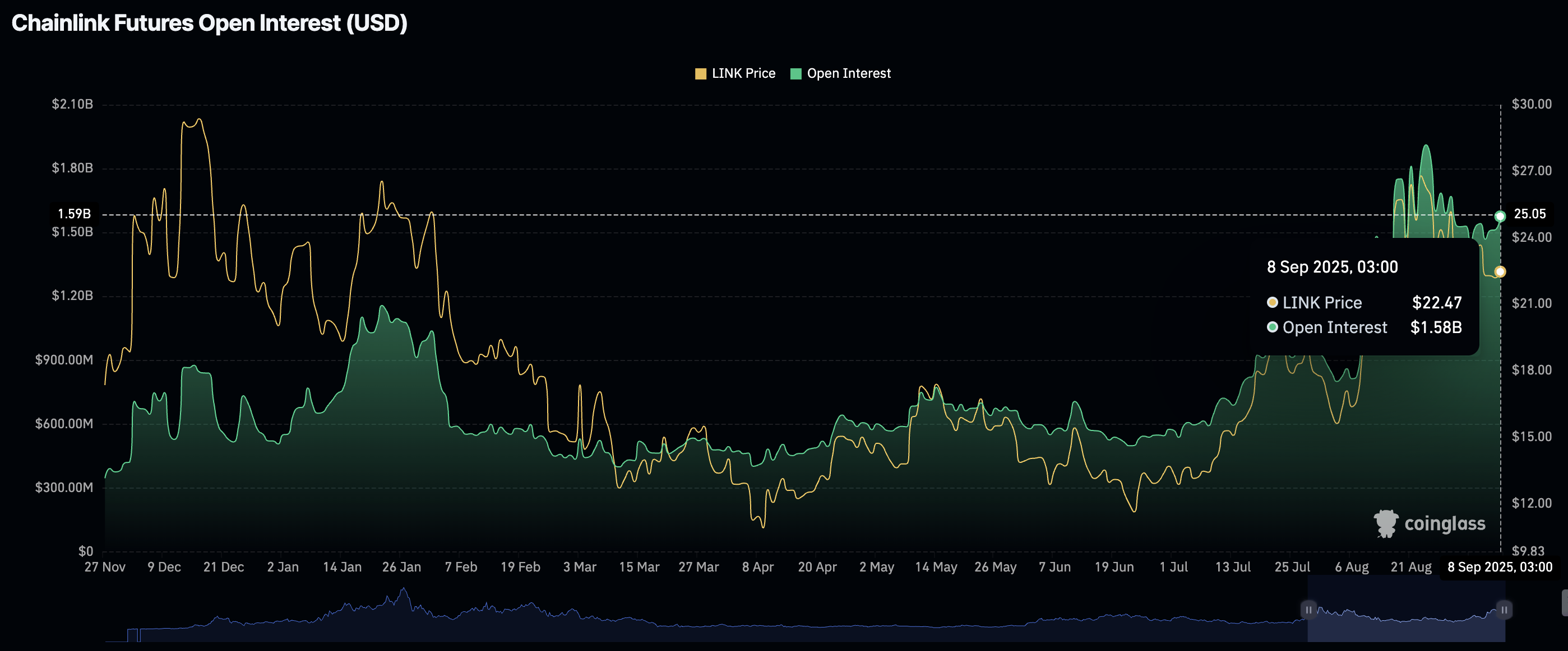 Song song với động thái của Grayscale, dữ liệu thị trường cho thấy sự quan tâm từ giới đầu tư bán lẻ đối với LINK cũng đang tăng lên. Hợp đồng mở (OI) của hợp đồng tương lai LINK đã đạt trung bình 1,58 tỷ USD tính đến thứ Hai, tăng đáng kể so với 1,47 tỷ USD được ghi nhận vào thứ Sáu tuần trước.