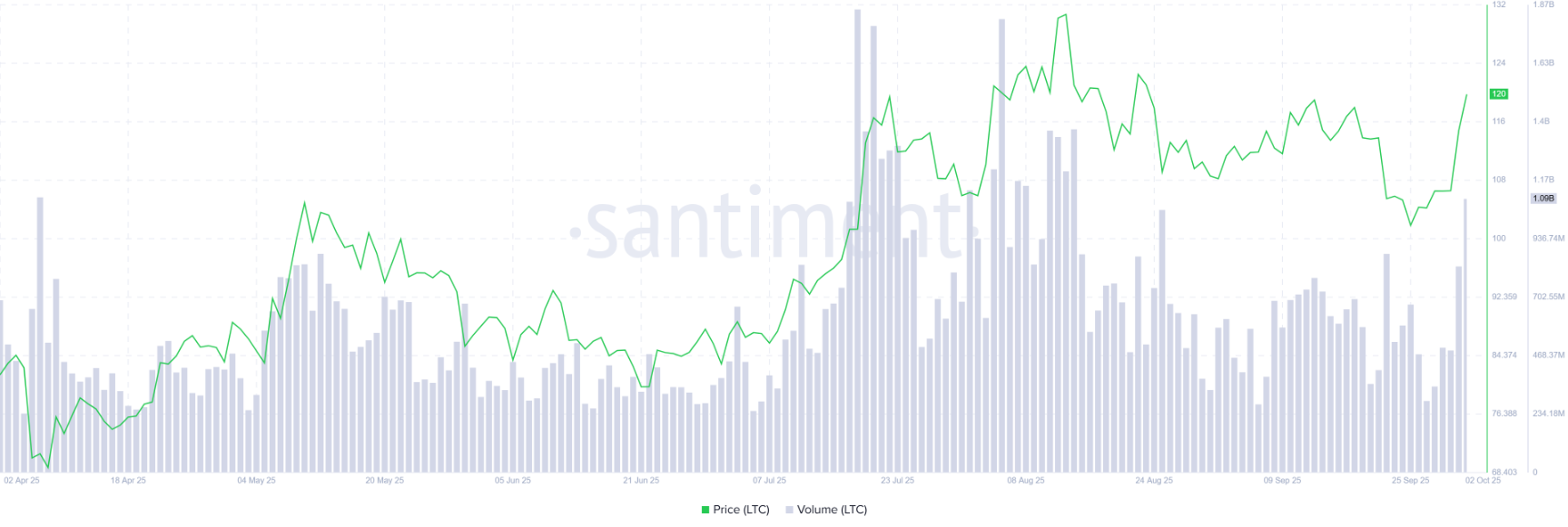 Cùng lúc đó, thanh khoản và mức độ quan tâm của giới giao dịch đối với LTC cũng bùng nổ mạnh mẽ. Số liệu từ Santiment ghi nhận khối lượng giao dịch của Litecoin đã tăng từ 286,7 triệu USD hôm thứ Ba lên 1,05 tỷ USD vào thứ Năm, mức cao nhất kể từ ngày 15/8.