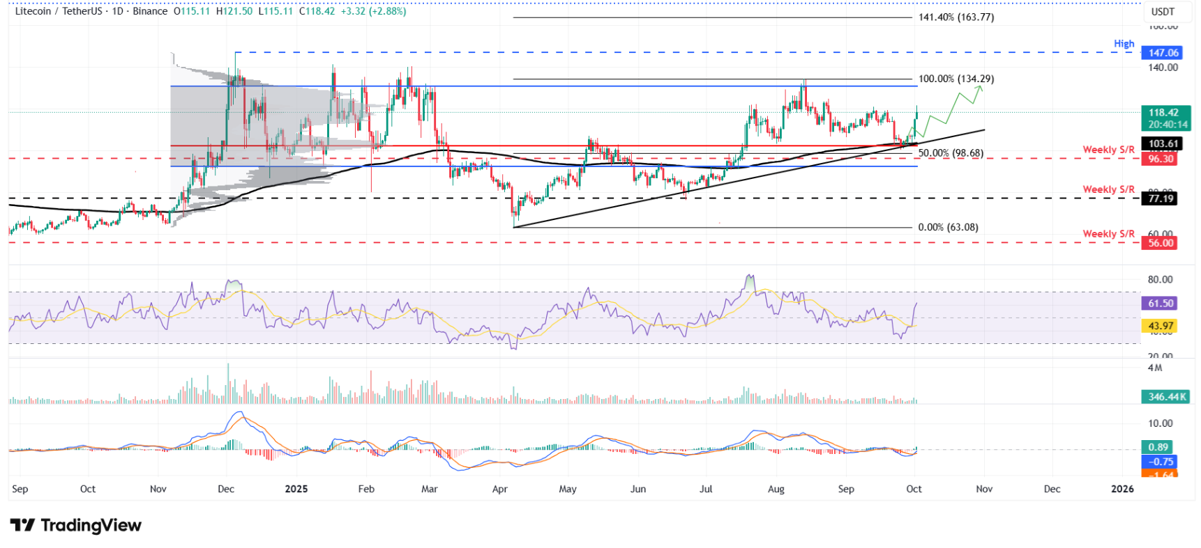 Nếu lực mua tiếp tục duy trì, Litecoin có thể hướng tới vùng kháng cự tiếp theo quanh 130 USD. Các chỉ báo kỹ thuật cũng củng cố triển vọng tích cực: RSI khung ngày đạt 61, vượt ngưỡng trung lập 50, cho thấy phe bò chiếm ưu thế, trong khi MACD vừa ghi nhận giao cắt tăng vào thứ Tư, phát tín hiệu mua và mở ra khả năng hình thành một xu hướng tăng.