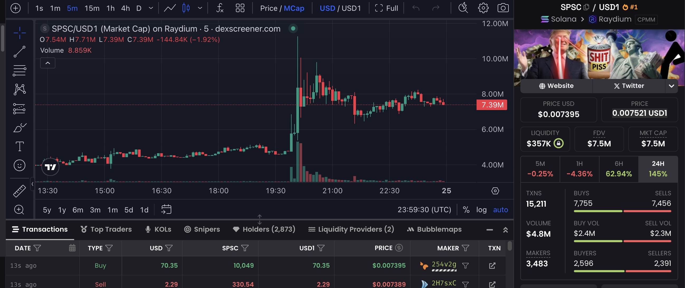 Sau thông báo, memecoin này tăng giá mạnh trước khi giảm nhẹ. Hiện SPSC đang giao dịch quanh mức 0,0063 USD, tăng 150% trong ngày, với vốn hóa thị trường khoảng 6,8 triệu USD.