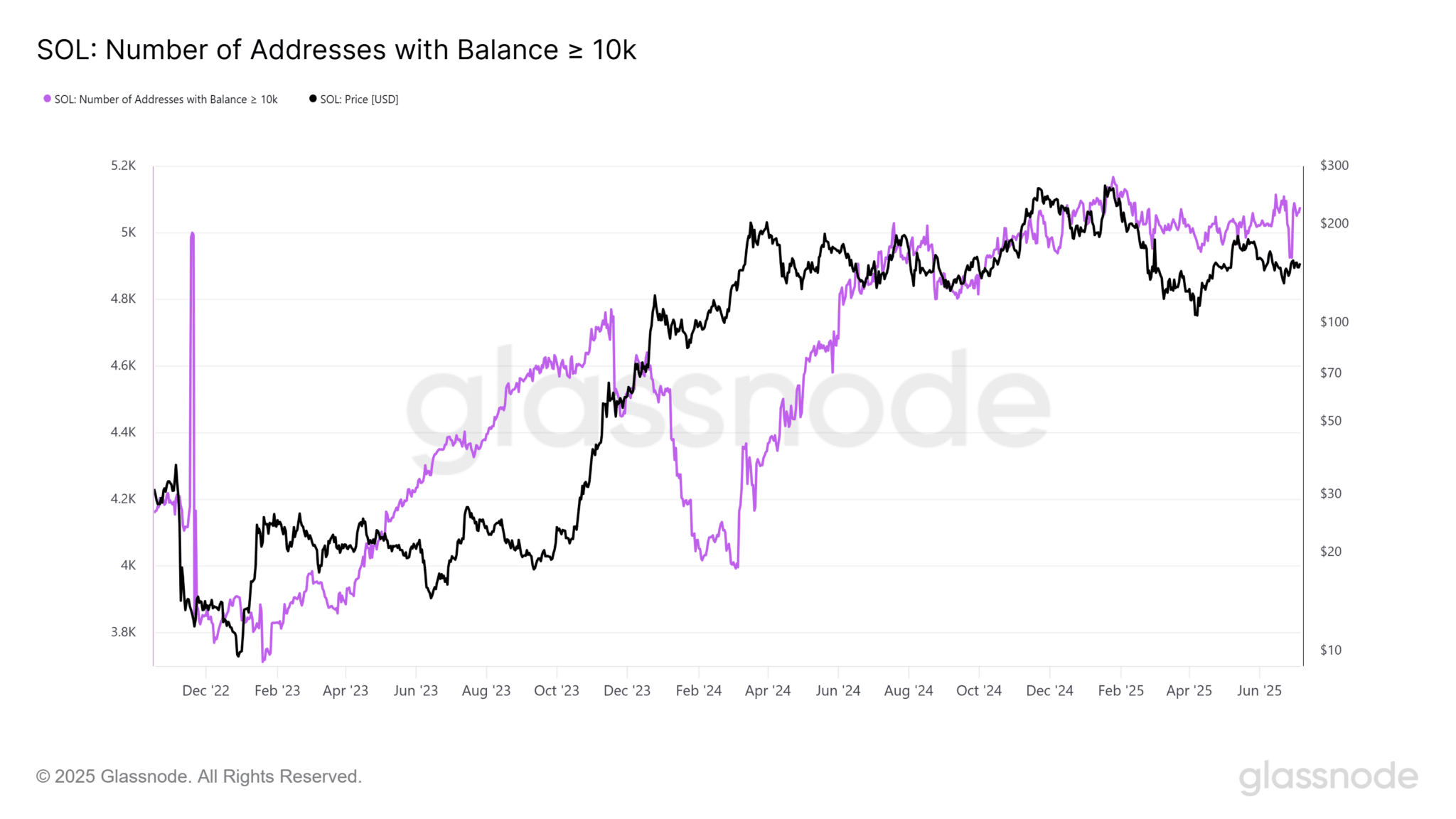 Số lượng các địa chỉ ví lớn (nắm giữ từ 10.000 SOL trở lên) đã tăng mạnh vào tháng 3 và 4/2024 – thời điểm giá Solana quanh mức $140. Trong suốt năm 2025, con số này ổn định quanh mốc 5.100 ví. Nếu số lượng holder lớn tiếp tục tăng, đây có thể là dấu hiệu cho thấy lòng tin đang quay trở lại từ các nhà đầu tư “cá mập”.
