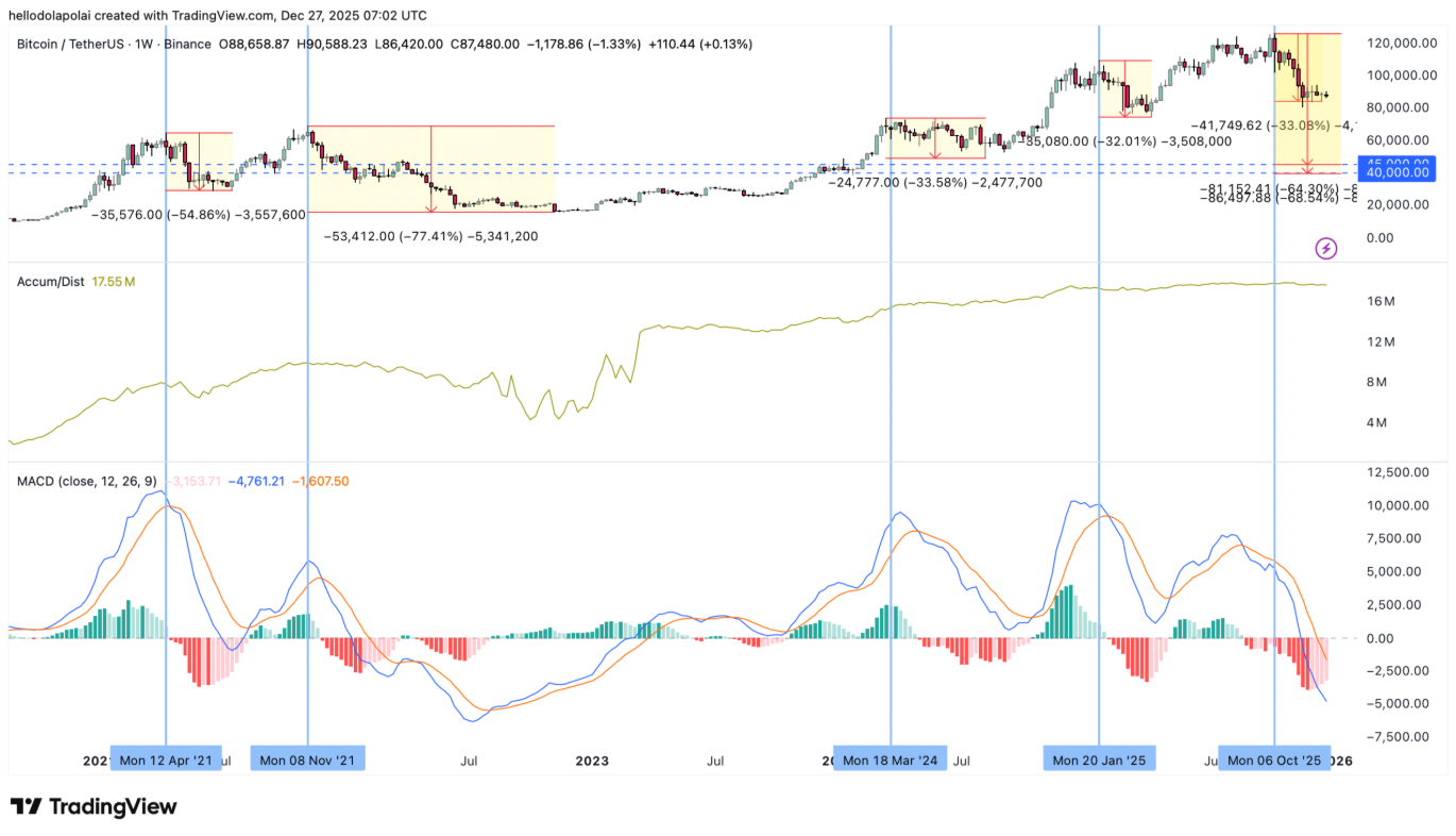 Tuy nhiên, trong kịch bản xấu hơn, nếu mô hình fractal tiếp tục phát huy độ chính xác và Bitcoin lùi sâu về khu vực 40.000–45.000 USD, tổng mức sụt giảm sẽ lên tới 64–68%. Khi đó, đây sẽ không còn là một đợt điều chỉnh ngắn hạn, mà là một pha điều chỉnh chu kỳ lớn đúng nghĩa.