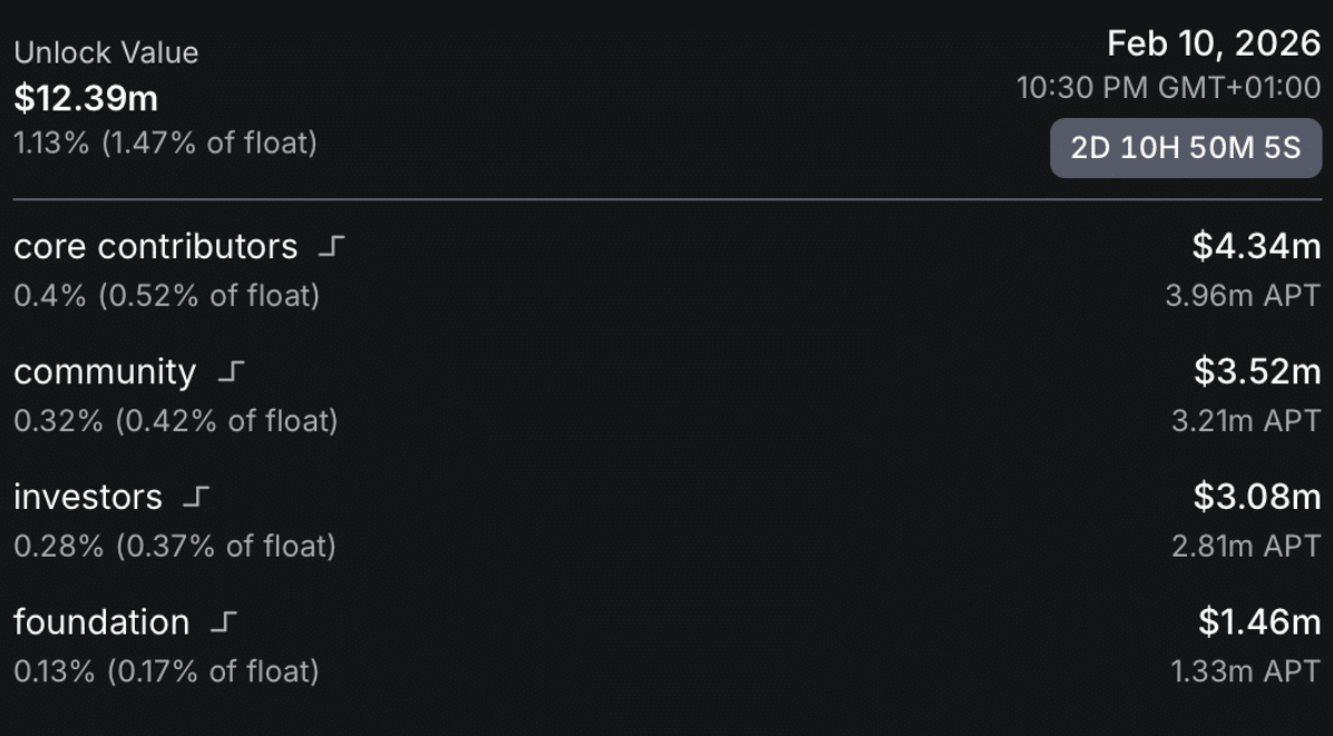 Dựa trên dữ liệu từ DeFiLlama, Aptos dự kiến tiến hành mở khóa token vào ngày 10/2, qua đó đưa khoảng 12,73 triệu USD giá trị APT vào lưu thông theo mức định giá tại thời điểm viết bài.