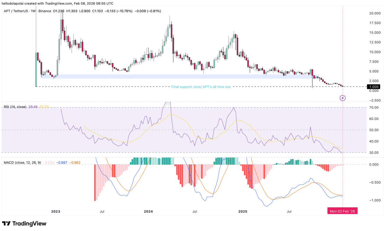 Trên khung thời gian tuần, APT đang đứng trước một ngưỡng kỹ thuật mang tính quyết định. Giá đã xuyên thủng vùng cầu phía trên – khu vực từng được xem là lớp hỗ trợ quan trọng, qua đó cho thấy cấu trúc suy yếu rõ rệt. Tại thời điểm ghi nhận, APT đang dao động quanh mốc tâm lý 1,00 USD, nơi áp lực giằng co giữa bên mua và bên bán trở nên đặc biệt nhạy cảm.