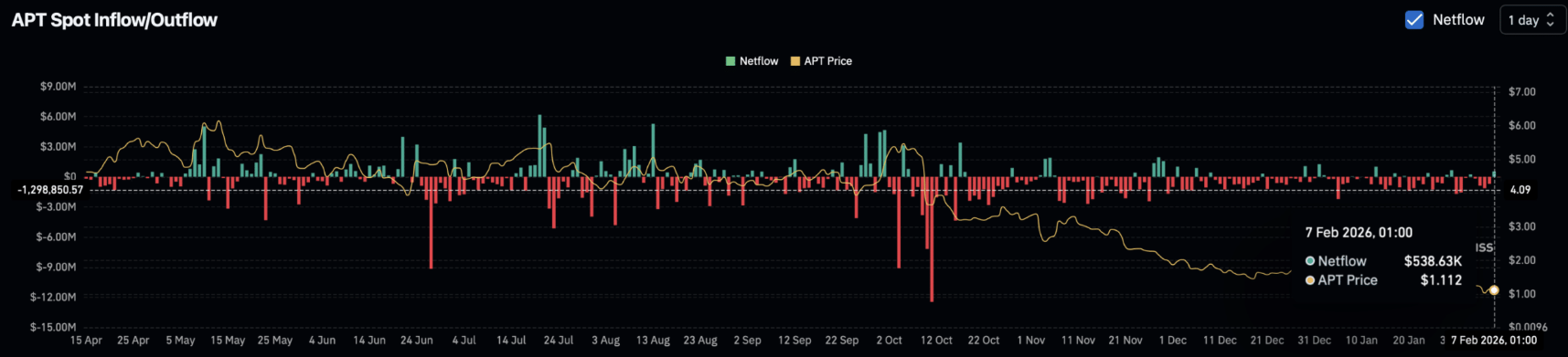 Tuy vậy, áp lực trong ngắn hạn vẫn chưa hoàn toàn biến mất. Dữ liệu dòng tiền ròng theo ngày cho thấy khoảng 536.000 USD APT đã chảy ròng vào các sàn, báo hiệu hoạt động bán ra vẫn đang hiện hữu trên thị trường.