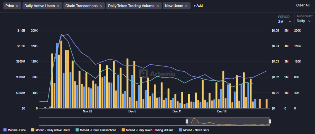 Theo dữ liệu từ Artemis, hoạt động mạng lưới của MON đang phản ánh một bức tranh tâm lý thị trường đan xen, nhưng hơi nghiêng về phía xu hướng tăng.