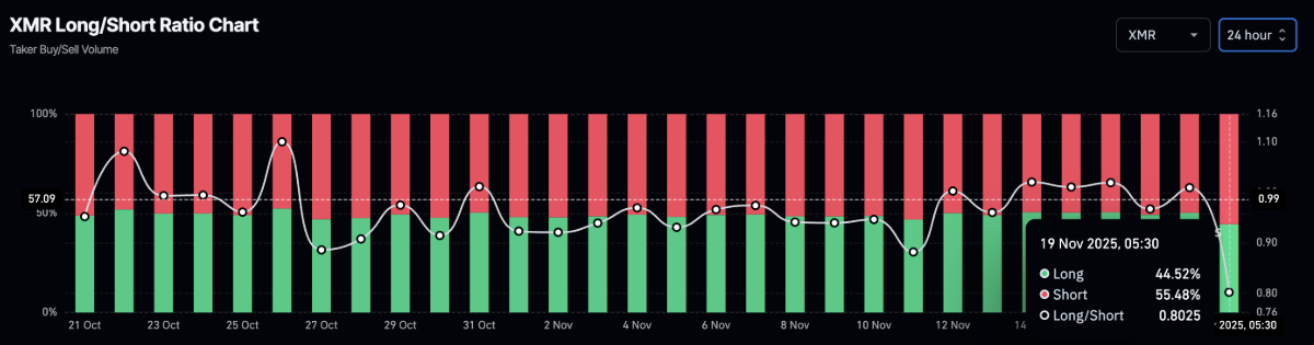 Tâm lý lo sợ trên thị trường càng rõ rệt khi biểu đồ tỷ lệ long/short của XMR cho thấy các vị thế short chiếm 55,48% tổng giao dịch, kéo tỷ lệ xuống 0,8025. Với xu hướng này, Monero có thể tiếp tục chịu áp lực bán gia tăng, khi đặt cược giảm giá mạnh hơn và thị trường phái sinh trở nên yếu đi.