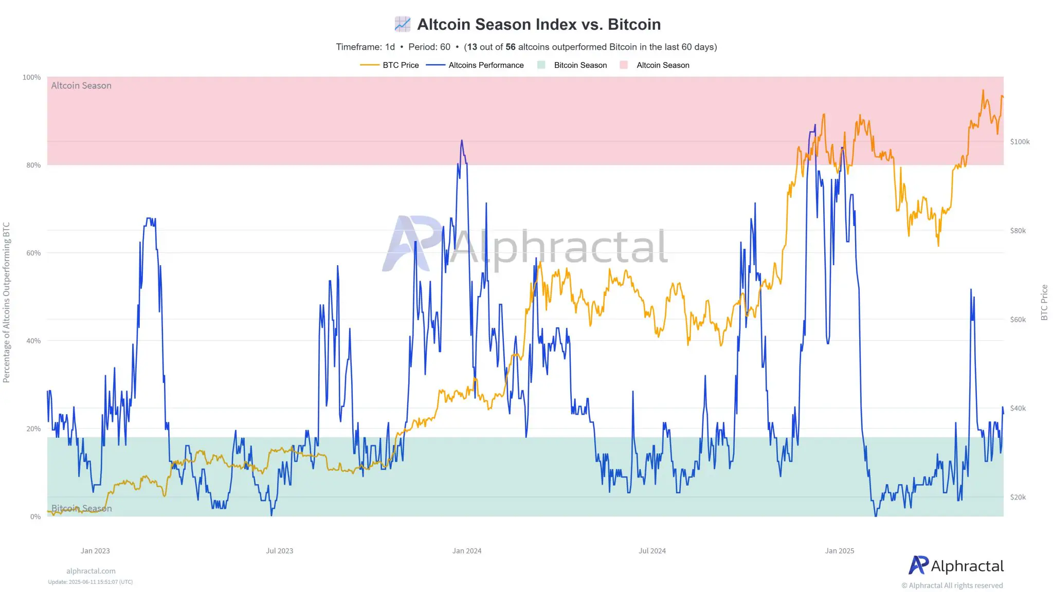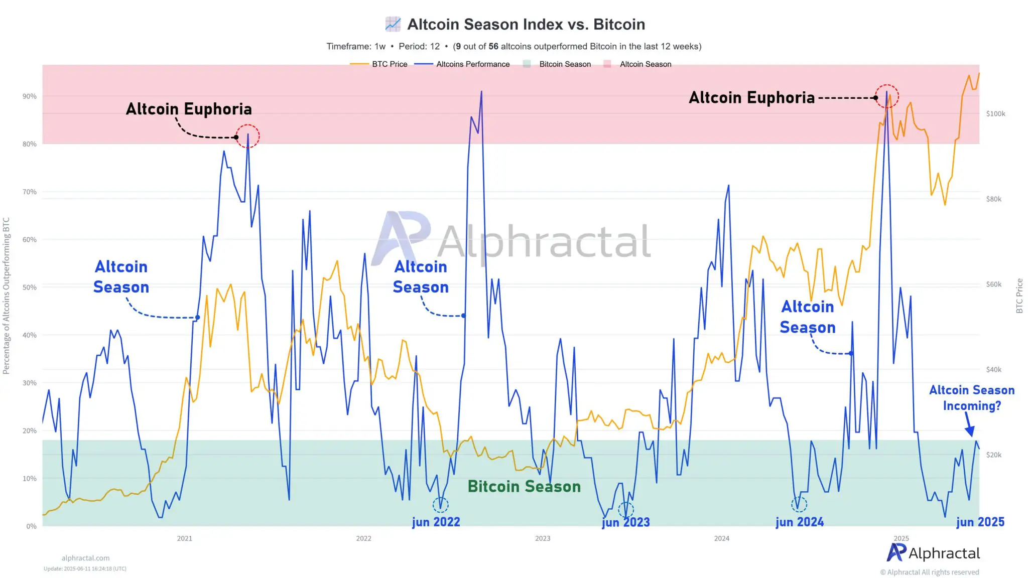 Một điểm đáng chú ý từ dữ liệu của Alphractal là kể từ năm 2022, tháng 6 đều là thời điểm khởi đầu cho các chu kỳ tăng trưởng của altcoin. Với những gì đang diễn ra trong nửa đầu tháng 6/2025, cộng với việc chỉ số Altcoin Season Index vừa thoát khỏi vùng ưu thế của Bitcoin, giới quan sát đang nâng mức cảnh giác. Hiện tại, khoảng 23% altcoin đã vượt trội hơn BTC, cho thấy sức mạnh ngầm đang được hình thành.