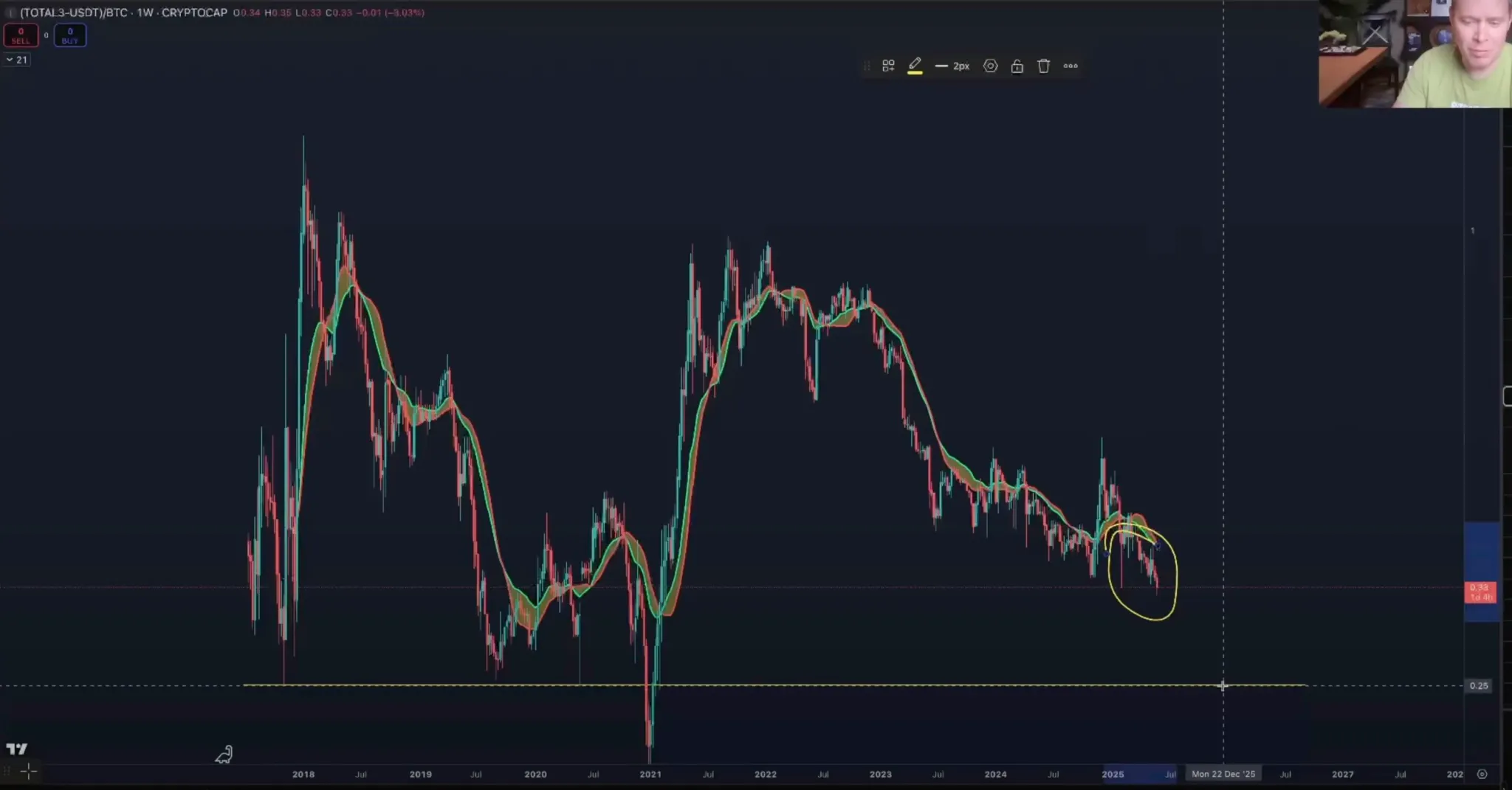Trong một buổi phân tích chiến lược mới đây, Cowen chia sẻ rằng biểu đồ TOTAL 3 – dùng để theo dõi tổng vốn hóa thị trường của tất cả tài sản kỹ thuật số, trừ Bitcoin, Ethereum (ETH) và stablecoin – vẫn đang duy trì đà giảm so với BTC và hiện chưa tìm thấy đáy thị trường.