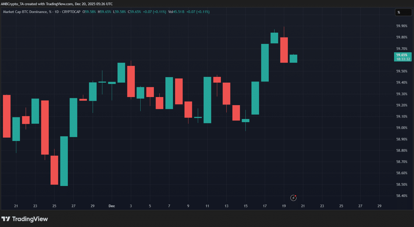 Tại thời điểm viết bài, tỷ lệ thống trị của Bitcoin đã quay trở lại quanh mức 59,6%, duy trì sát các đỉnh gần đây thay vì suy yếu. Dòng vốn vẫn tập trung chủ yếu vào BTC, trong khi chỉ số mùa altcoin chỉ dừng ở mức 35 — thấp hơn đáng kể so với ngưỡng cần thiết để altcoin thực sự vượt trội.
