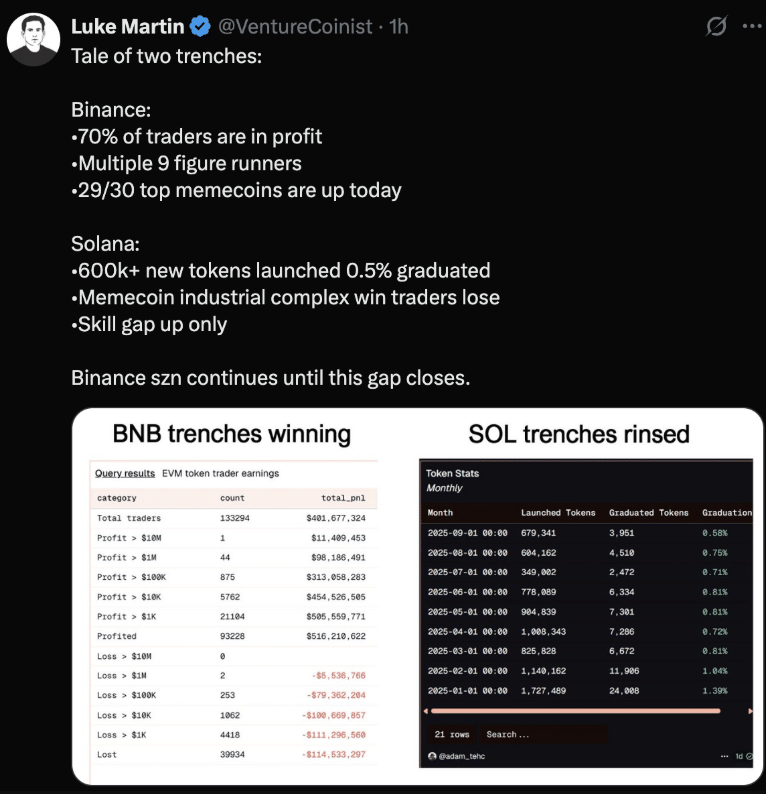 Nhà phân tích thị trường Luke Martin đã chỉ ra sự tương phản rõ nét giữa hai hệ sinh thái. Ông cho biết, trong khi Solana chứng kiến hơn 600.000 token ra mắt trong năm nhưng chỉ 0,5% còn tồn tại, thì hệ memecoin trên BNB lại trở thành “trung tâm lợi nhuận” mới. Martin nhận định: