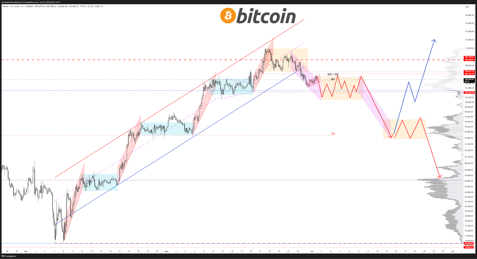 Trong trường hợp hiện tại, mô hình bắt đầu hình thành sau khi Bitcoin chạm đáy quanh mức 103.100 đô la vào ngày 31/5. Kể từ đó, giá tiếp tục di chuyển trong biên độ hẹp và liên tục retest vùng hỗ trợ dưới của cờ – cho thấy xu hướng hợp nhất vẫn còn tiếp diễn trong suốt cuối tuần.
