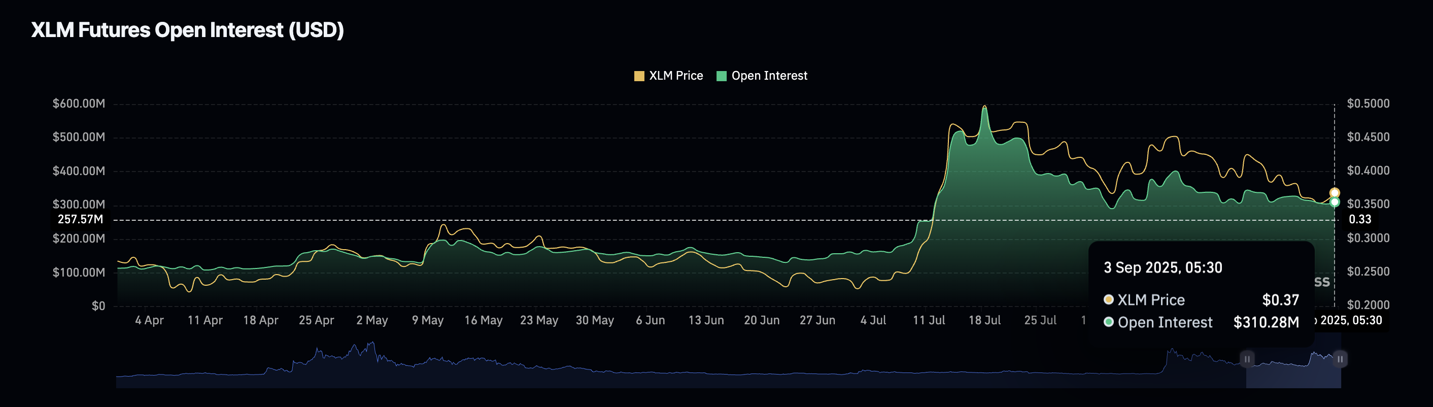 Dữ liệu từ CoinGlass cho thấy hợp đồng mở (OI) của XLM đã tăng 2% trong 24 giờ qua, đạt 310 triệu USD. Tuy nhiên, sự ổn định quanh ngưỡng 300 triệu USD lại cho thấy nguy cơ trì trệ, phản ánh mức độ quan tâm giảm dần của các nhà giao dịch phái sinh.