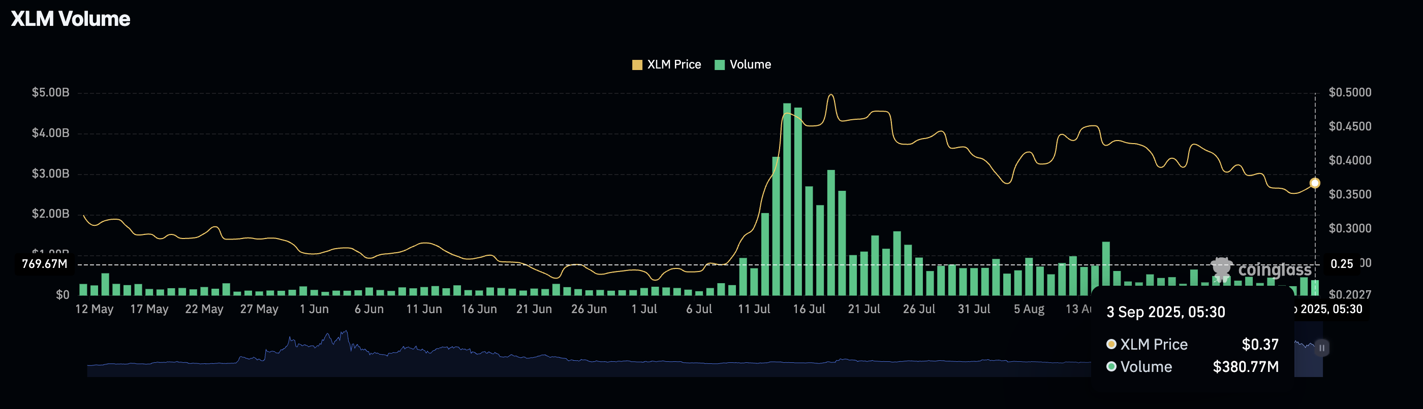 Trên thị trường giao ngay, giá XLM đã lùi về 0,363 USD trong phiên thứ Tư, song vẫn trụ vững trên ngưỡng hỗ trợ then chốt 0,361 USD – mức được xác định từ đáy trục ngày 3/8. Động thái này diễn ra sau khi XLM bất ngờ phục hồi từ đáy 0,344 USD vào thứ Hai, qua đó chấm dứt chuỗi ba tuần giảm liên tiếp và mang lại hy vọng cho phe mua.