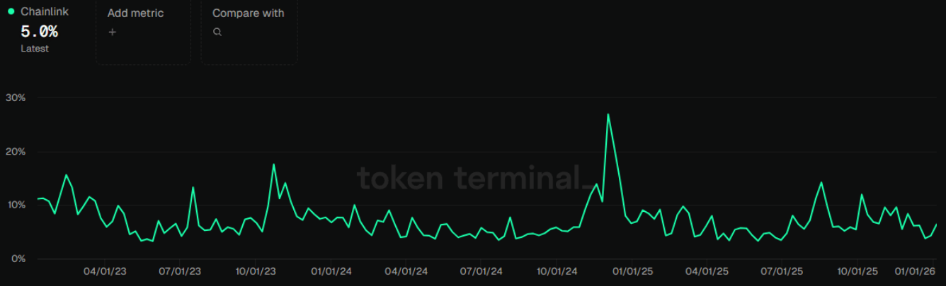 Trong vòng 24 giờ qua, khối lượng token LINK lưu hành đã tăng khoảng 5%. Trong bối cảnh giá đang điều chỉnh, sự gia tăng này thường phản ánh quá trình tái phân bổ và cơ cấu lại vị thế của nhà đầu tư, thay vì áp lực bán tháo mang tính hoảng loạn.
