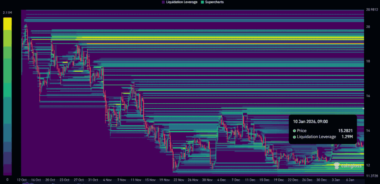 Dữ liệu thanh khoản từ Coin Photon cho thấy một mục tiêu ngắn hạn tương đối rõ ràng cho LINK. Theo bản đồ nhiệt thanh khoản, một cụm thanh khoản đáng chú ý trị giá khoảng 1,32 triệu USD đang tập trung quanh vùng giá 15 USD.