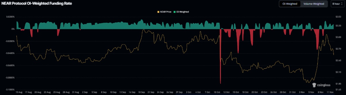 Trên thị trường phái sinh, NEAR dường như đang sẵn sàng cho một đợt phục hồi. Dữ liệu funding rate từ Coinglass cho thấy số lượng trader kỳ vọng giá NEAR giảm thấp hơn so với số lượng dự đoán giá tăng. Chỉ số này đã chuyển sang mức dương vào Chủ nhật và duy trì ở mức 0,0079% vào thứ Tư, phản ánh rằng các vị thế Long đang trả phí cho Short – một dấu hiệu rõ ràng của tâm lý tăng giá trên thị trường.
