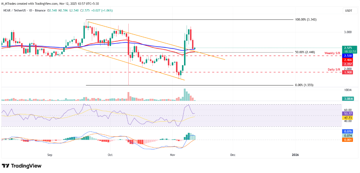 NEAR Protocol vừa ghi nhận một cú bứt phá mạnh khỏi mô hình cái nêm giảm vào thứ Sáu, với mức tăng hơn 11% trong hai ngày tiếp theo. Tuy nhiên, đầu tuần này đà tăng đã chững lại khi NEAR lao dốc hơn 17% đến thứ Ba, kiểm tra lại đường EMA 200 ngày tại 2,53 USD. Tại thời điểm viết bài vào thứ Tư, NEAR đã hồi phục nhẹ, giao dịch quanh mức 2,57 USD.