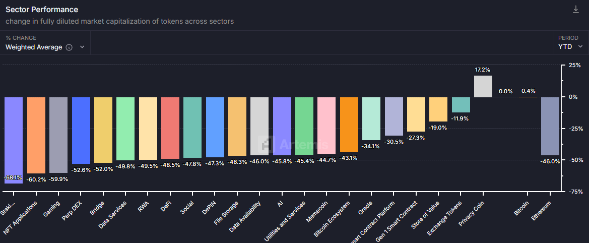 Dữ liệu từ nền tảng phân tích Artemis chỉ ra một xu hướng đáng chú ý. Kể từ đầu năm 2025, các đồng tiền tập trung vào quyền riêng tư như Monero là lĩnh vực duy nhất trong thị trường tiền điện tử ghi nhận sự tăng trưởng tích cực, với mức tăng hơn 17%.