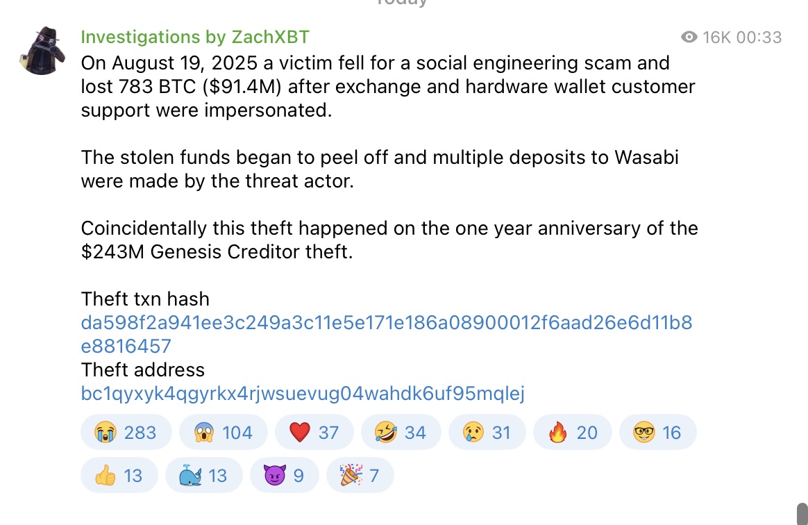 Một nhà đầu tư tiền điện tử đã mất 783 Bitcoin—tương đương 91 triệu USD tại thời điểm xảy ra vụ tấn công—vào ngày thứ Ba sau khi trở thành nạn nhân của một chiêu trò lừa đảo tinh vi (social engineering), theo thông tin từ điều tra viên ẩn danh ZachXBT.