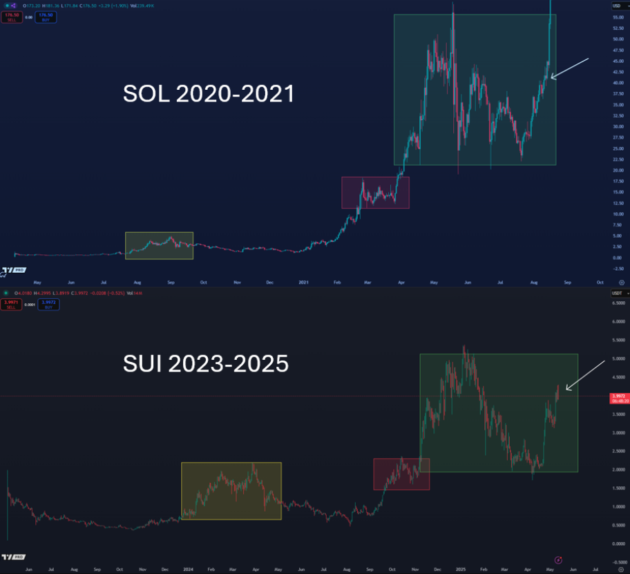 SUI đang nổi lên như một layer-1 dẫn dắt xu hướng trong chu kỳ này – vai trò mà SOL từng đảm nhiệm cách đây vài năm.