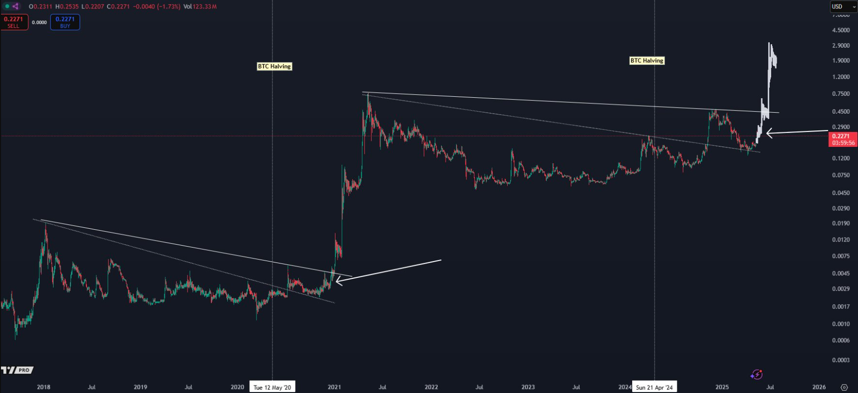Dựa trên phân tích của mình, ông dự báo DOGE có thể chạm ngưỡng $3 trước khi năm 2025 khép lại – một bước nhảy vọt đáng kinh ngạc so với mức giá hiện tại là $0,234.