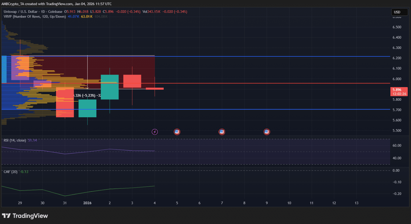Nếu không sớm tái chiếm mốc 6 USD kèm theo sự cải thiện đáng kể về khối lượng giao dịch, UNI nhiều khả năng sẽ tiếp tục bước vào giai đoạn tích lũy kéo dài ngay bên dưới vùng kháng cự quan trọng này.