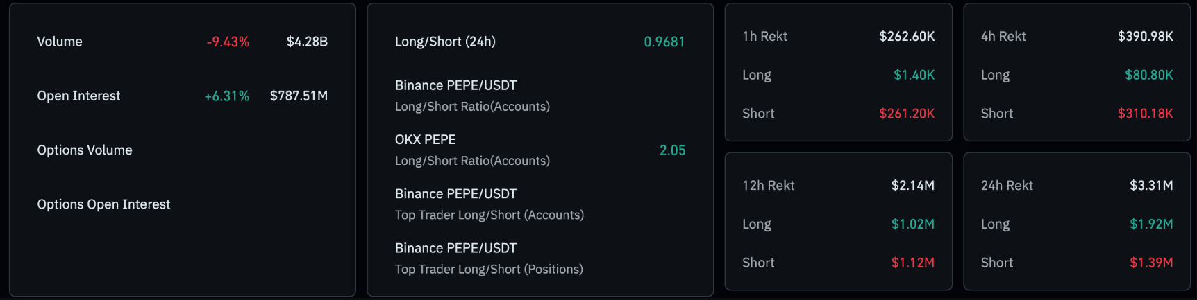 Dữ liệu từ CoinGlass cho thấy khối lượng hợp đồng mở (OI) của PEPE đã tăng 6,31% trong 24 giờ qua, lên mức kỷ lục 787,51 triệu USD – một dấu hiệu cho thấy dòng tiền đang đổ mạnh trở lại.