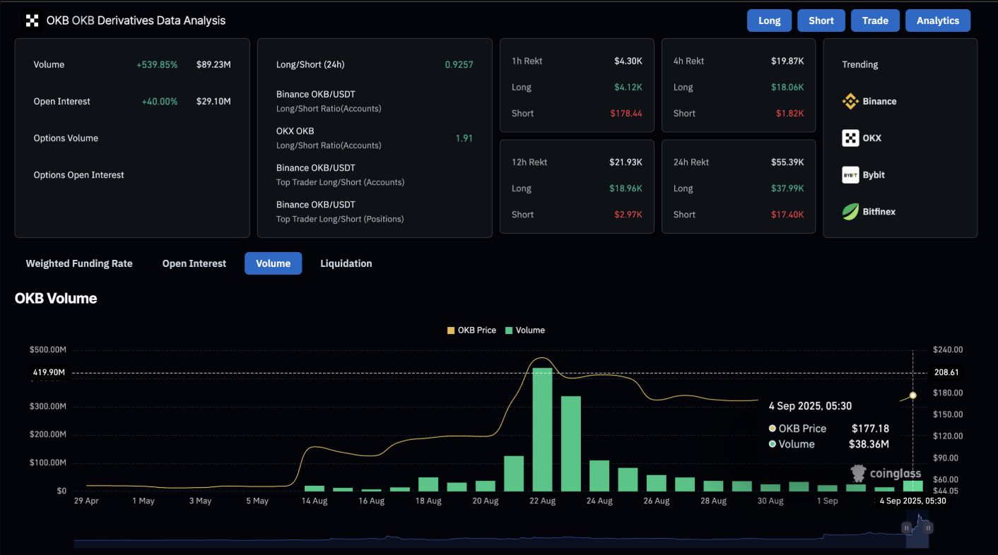Theo dữ liệu từ CoinGlass, hợp đồng mở (OI) của OKB đã bật tăng tới 40% chỉ trong 24 giờ, chạm ngưỡng 29,10 triệu USD. Đà tăng hai chữ số này phản ánh rõ rệt dòng vốn mới đang đổ mạnh vào thị trường, khi tâm lý “risk-on” lan tỏa và khuyến khích giới trader gia tăng nắm giữ OKB.