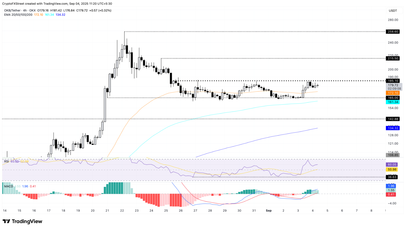 Trên khung 4 giờ, OKB đang tiến sát ngưỡng trên của phạm vi tích lũy kéo dài trong biên độ 165 – 185 USD. Pha bật mạnh từ mốc 165 USD giúp giá duy trì trên đường EMA 50 kỳ tại 172 USD, củng cố nền tảng cho xu hướng đi lên.
