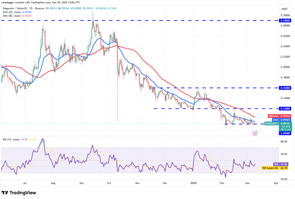 Dogecoin (DOGE) hiện giao dịch quanh 0,09 USD. Đồng coin này đã giảm xuống dưới vùng hỗ trợ 0,09 USD vào Chủ nhật, nhưng phe gấu không thể duy trì mức giá thấp hơn. Phe bò đã tận dụng nhịp giảm để bắt đáy và đang cố gắng giành lại mốc này.