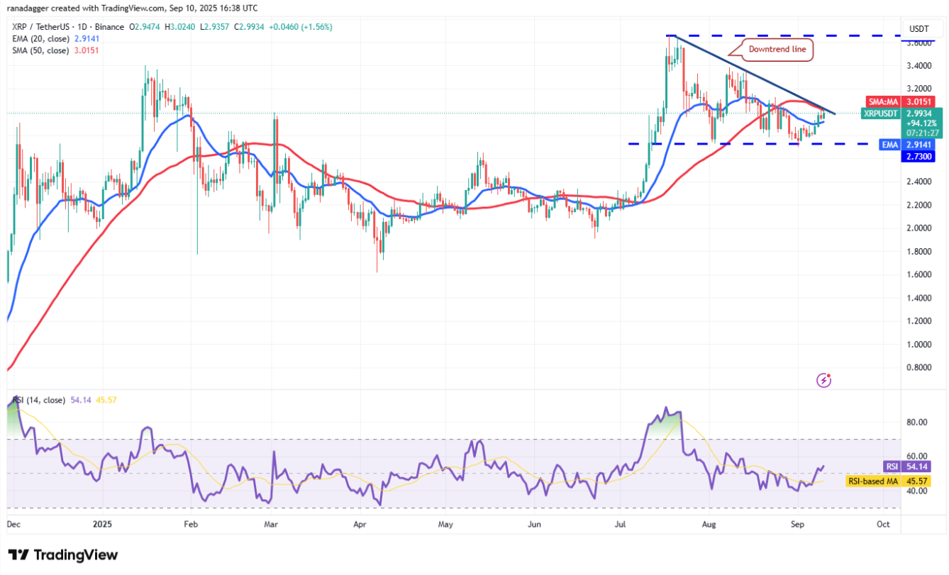 XRP quay đầu giảm từ đường xu hướng giảm hôm thứ Ba, nhưng phe bò đã không để giá rơi xuống dưới đường EMA 20 ngày ở mức 2,91 USD.