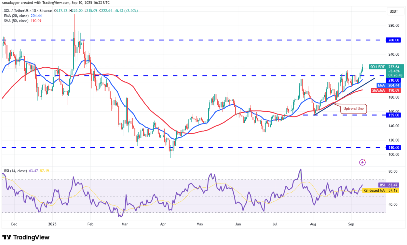 Đường EMA 20 ngày dốc lên cùng chỉ số RSI ở vùng tích cực cho thấy lợi thế nghiêng về phe bò. Cặp SOL/USDT có thể tiến tới 240 USD và sau đó là 260 USD, nơi phe gấu nhiều khả năng sẽ gia tăng áp lực.