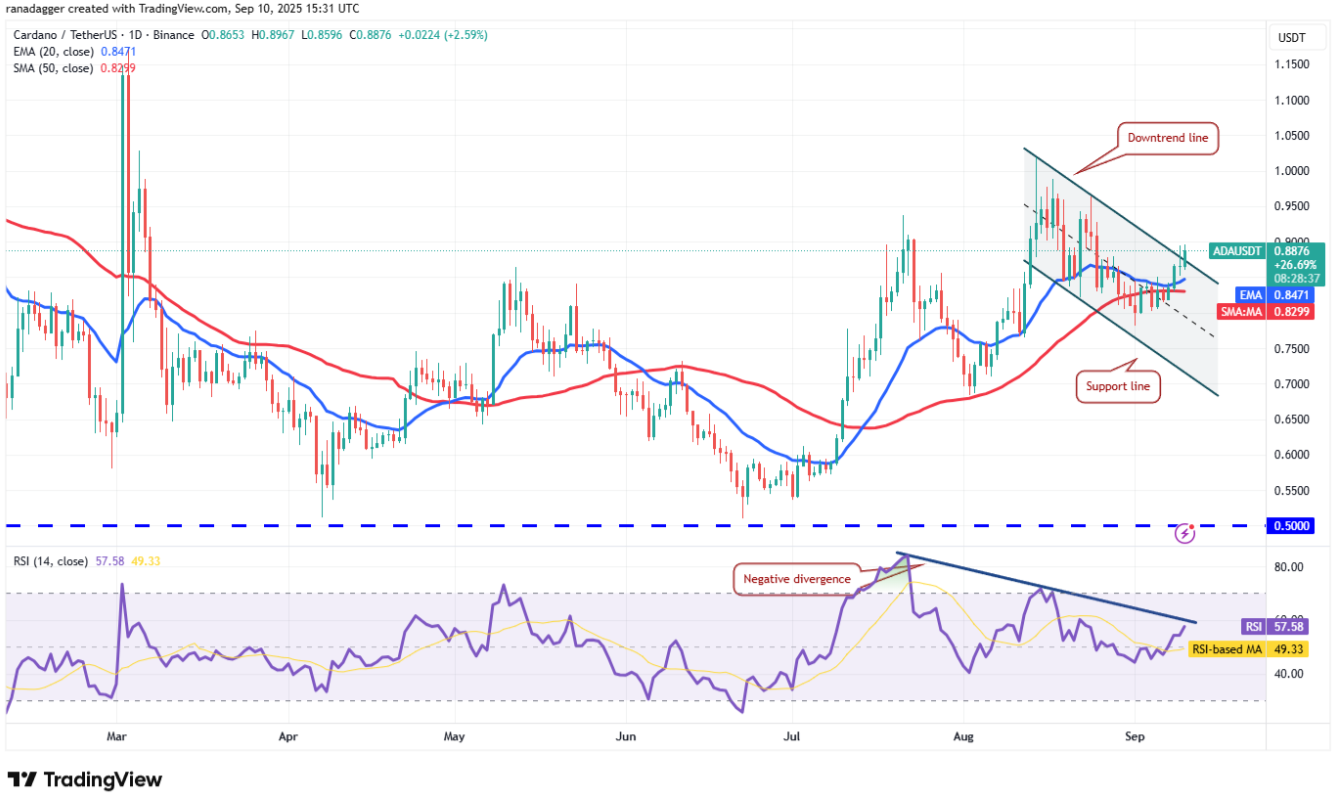 Lực mua đã đẩy Cardano (ADA) lên mức 0,8847 USD, vượt qua đường xu hướng giảm của mô hình kênh song song giảm dần.