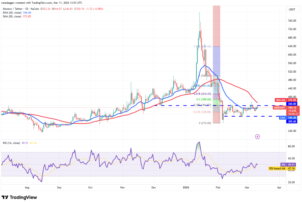 Đường EMA 20 ngày đi ngang (346 USD) và RSI quanh mức trung bình cho thấy chưa có bên nào chiếm ưu thế rõ rệt. Nếu phe bò đẩy giá Monero vượt qua đường SMA 50 ngày, cặp XMR/USDT có thể tăng tốc lên mức Fibonacci thoái lui 61,8% tại 414 USD, và sau đó là 452 USD.
