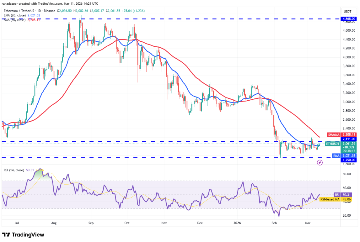 Phe bò đã cố gắng đẩy Ether (ETH) vượt qua mức kháng cự 2.111 USD vào thứ Ba, nhưng phe gấu vẫn giữ vững vị thế.