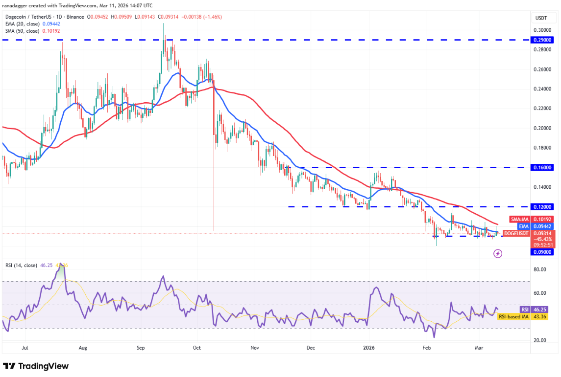 Dogecoin (DOGE) đã tăng lên đường SMA 50 ngày (0,10 USD) vào thứ Ba, nhưng phe bò không thể phá vỡ mức kháng cự.