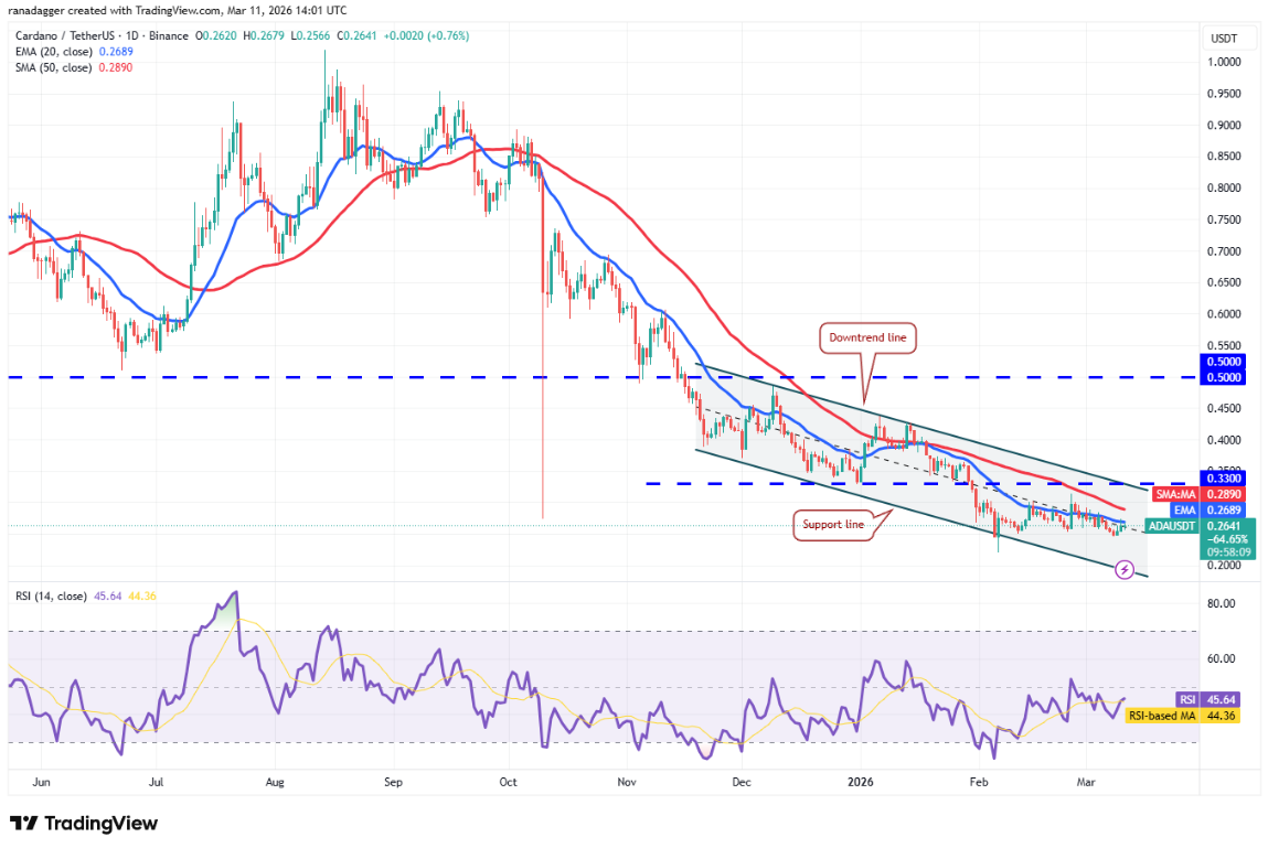 Cardano (ADA) vẫn đang giao dịch trong mô hình kênh giảm dần, cho thấy phe gấu vẫn kiểm soát xu hướng.
