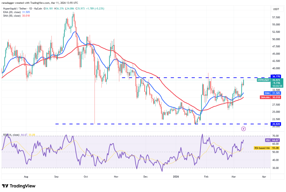 Đường EMA 20 ngày (31,50 USD) bắt đầu hướng lên và RSI nằm trong vùng tích cực, cho thấy xu hướng ít kháng cự nhất hiện tại là đi lên. Phe bò sẽ cố gắng đẩy giá Hyperliquid vượt vùng kháng cự 36,77 – 38,42 USD. Nếu thành công, cặp HYPE/USDT có thể tăng lên 43 USD và sau đó là 50 USD.